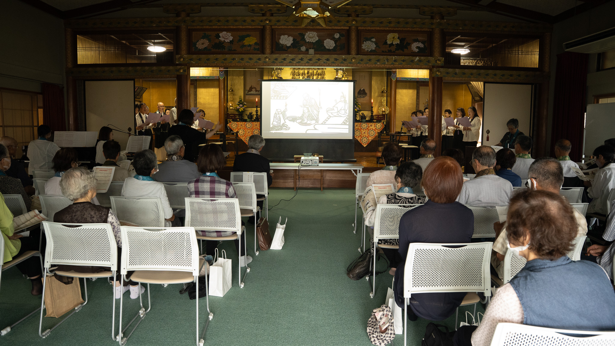 前住職が光林寺に入寺して昭和45年11月に光輪会が結成し、仏教婦人会は、光林寺が再建された昭和49年3月に再結成され、どちらとも門徒・他門徒は問わず毎月集まり、これまで共に聴聞し、光林寺を支え続けて今日に至りました。 記念大会では、 東九州短期大学教授尾家先生の指揮や演奏者による、 親鸞様・恵信尼様のご一生をスライドショーで流しながら、 光林寺コーラス会員で歌いました。 続いて記念講師には、 大阪府から高齢者福祉施設を運営されている野村康治師(瑞松寺住職)に講演していただきました。