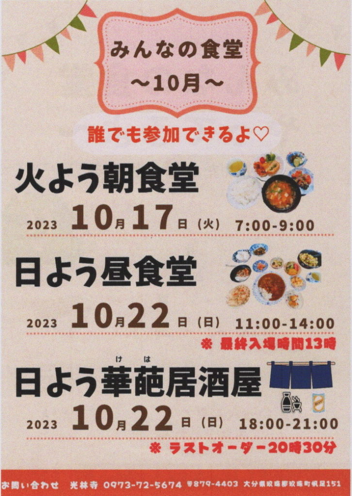 みんなの朝食堂【火よう朝食堂】 2023年9月25日 最終更新日時 : 2023年9月25日 光林寺 開催日: 2023年10月17日 6:30 AM - 9:00 AMカテゴリー: みんなの食堂 「みんなの朝食堂」を行います。100円持ってきてくださいね。 6:30〜9:00 やっています。 子どもも大人も一緒にご飯を食べましょう!美味しいよ!