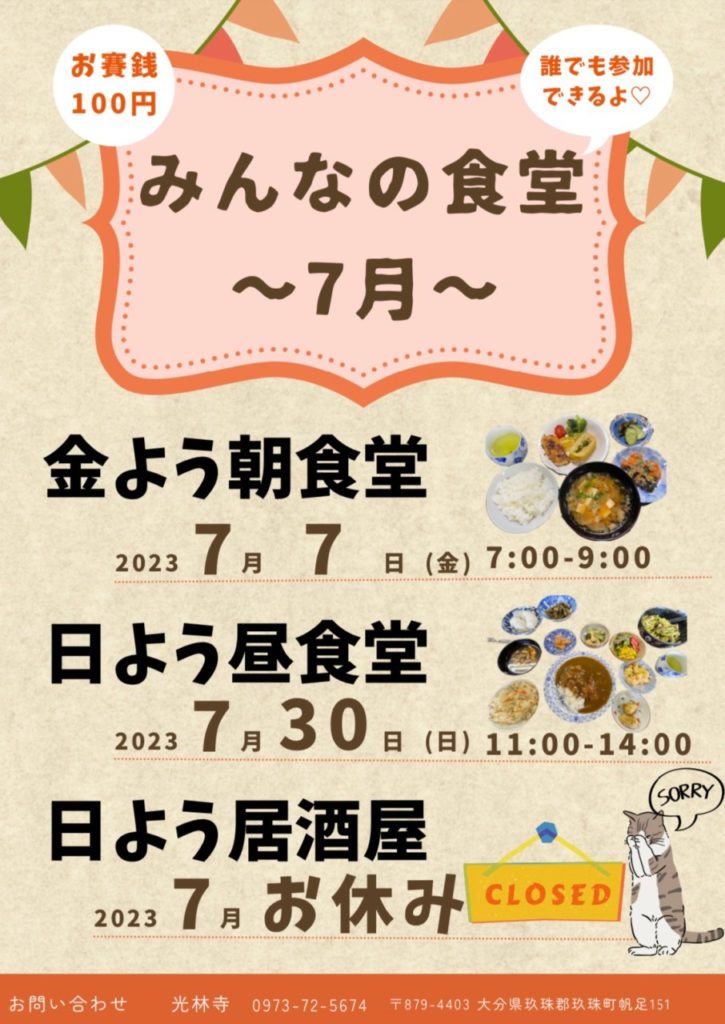 みんなの朝食堂 2023年7月1日 最終更新日時 : 2023年7月1日 光林寺 開催日: 2023年7月7日 7:00 AM - 9:00 AMカテゴリー: みんなの食堂 「みんなの朝食堂」を行います。100円持ってきてくださいね。 7:00〜9:00 やっています。 子どもも大人も一緒にご飯を食べましょう!美味しいよ!